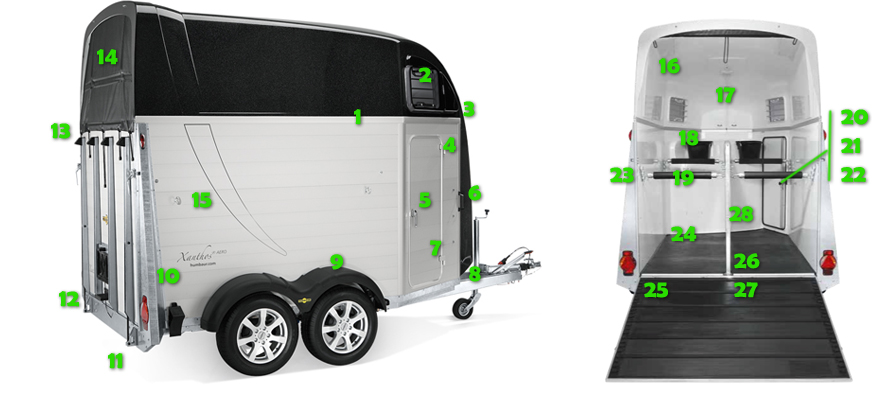 - Verdeckte 3-Punktverriegelung bei Einstiegstüre (keine Verletzungsgefahr des Pferdes) und abschließend mit formschönen eloxierten Aluminiumprofilen eingefaßt.